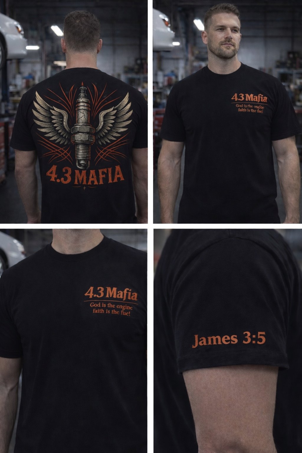 This 4.3 Mafia tee blends bold craftsmanship with an unshakable message. Featuring a striking back graphic of a winged spark plug—symbolizing power, purpose, and divine ignition—this shirt represents the lifestyle of those who keep their faith at the center of everything they do.